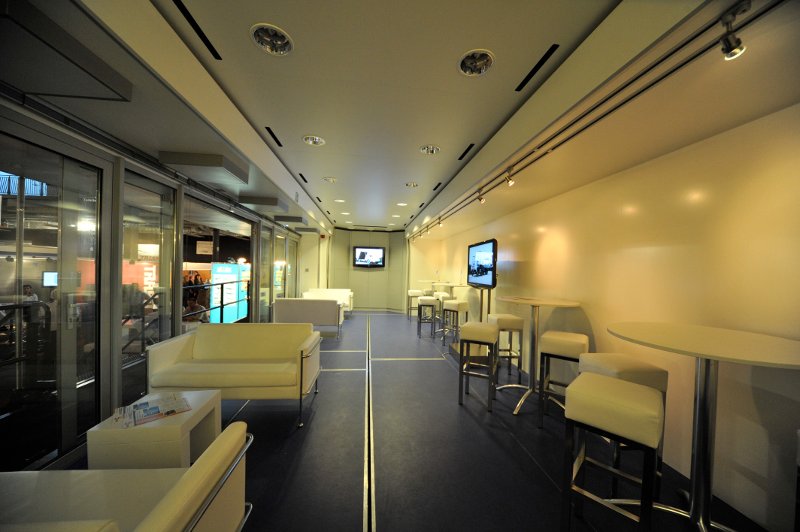 Beide Seiten mit dach Dachterrasse, Klapptisch. Auch Dachterrasse in 8 m Höhe möglich, um mit ihren Gäste das Messegelände oder das Rennen von oben zu betrachten.